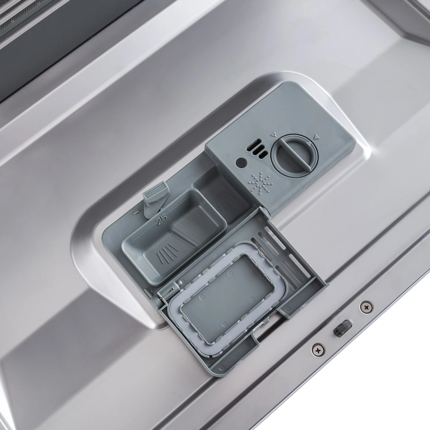 - zwei Kontrollleuchten informieren über notwendige Nachfüllungen von Reinigungssalz und Klarspüler