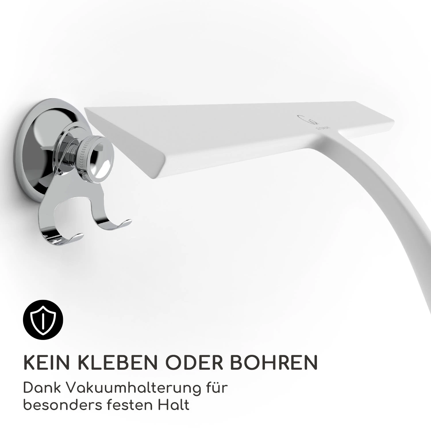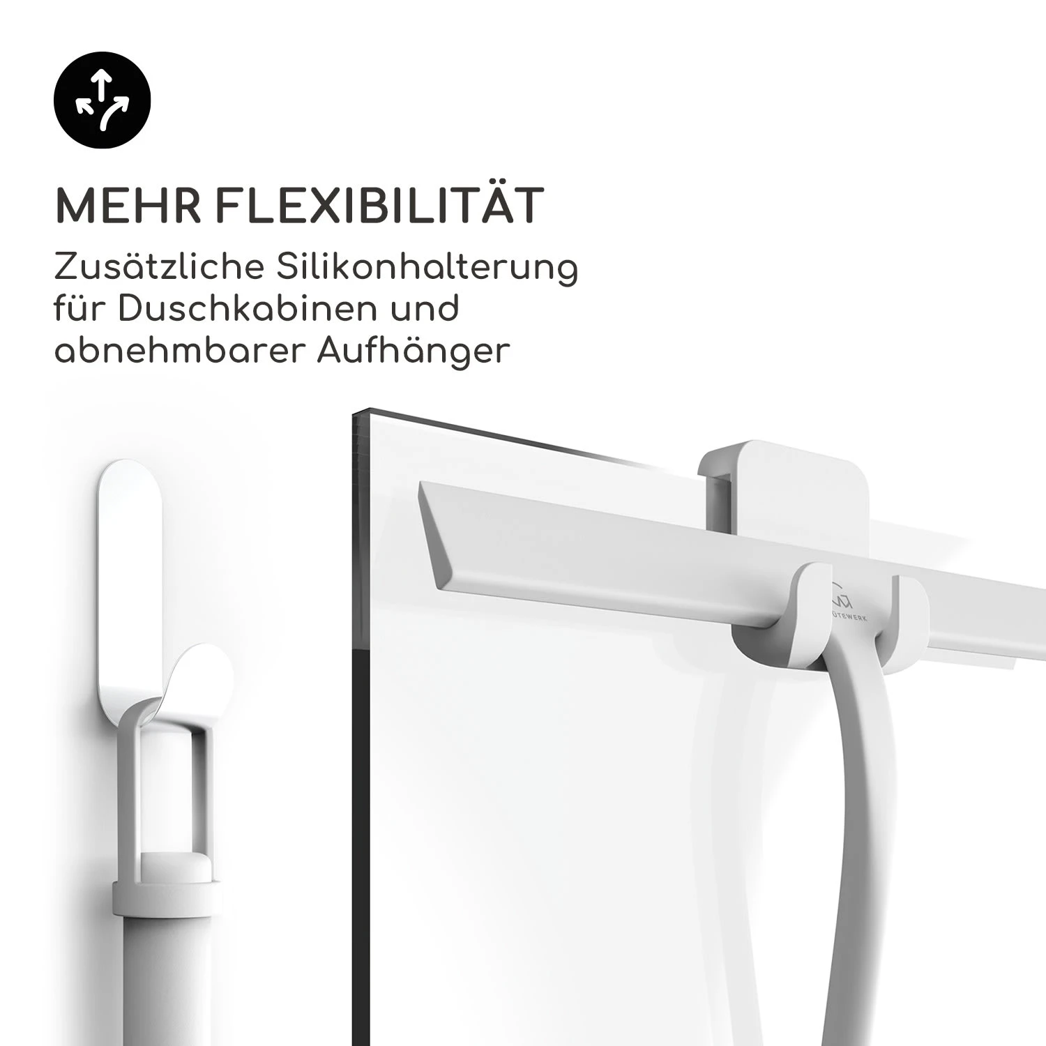 Stylisher Helfer mit großer Wirkung: Der Gütewerk by blumfeldt Blaze Duschabzieher reinigt und entfernt zuverlässig Wassertropfen und Feuchtigkeit von glatten Flächen. Ob beim Fensterputzen oder in der Duschkabine, die weiche Silikonklinge sorgt für streifenfreien Glanz. Damit der Scheibenwischer auch immer griffbereit ist, sind im Lieferumfang gleich drei unterschiedliche Halterungen dabei: eine Vakuum-Edelstahlhalterung, eine Silikonhalterung und ein abnehmbarer Silikonhaken. Alle Aufhängungen kannst du ohne Bohren oder Kleben ganz einfach anbringen. Das moderne und clevere Design runden das Bild exzellent ab. Der solide Edelstahlkern ist von einer weichen Silikonhülle umschlossen, das verringert Quietschen und wirkt beim Fallen dämpfend, so werden Schäden in der Duschkabine, auf den Fliesen oder dem Boden vermieden.
