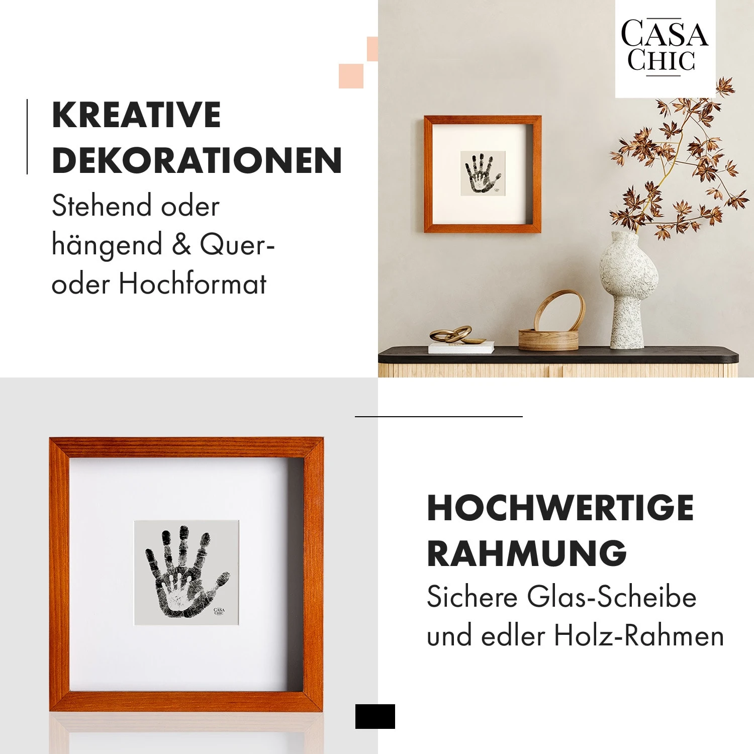 Besondere Tiefe für deine Bilder! Den handgefertigten Camden Bilderrahmen von Casa Chic by blumfeldt aus Echtholz kannst du sowohl als Aufsteller als auch zur Wandmontage verwenden. Durch seine Tiefe eignet er sich hervorragend zur Darstellung von 3D-Objekten. Neben dem Box-Rahmen für Bilder von 23 x 23 cm lassen sich durch das Passepartout mit einem Ausschnitt von 10 x 10 cm auch kleinere Objekte besonders eindrücklich in Szene setzen. Die Scheibe des Bilderrahmens ist aus echtem Glas gefertigt und verstärkt so die edle Erscheinung des 4,5 x 2 cm großen Rahmenprofils.
