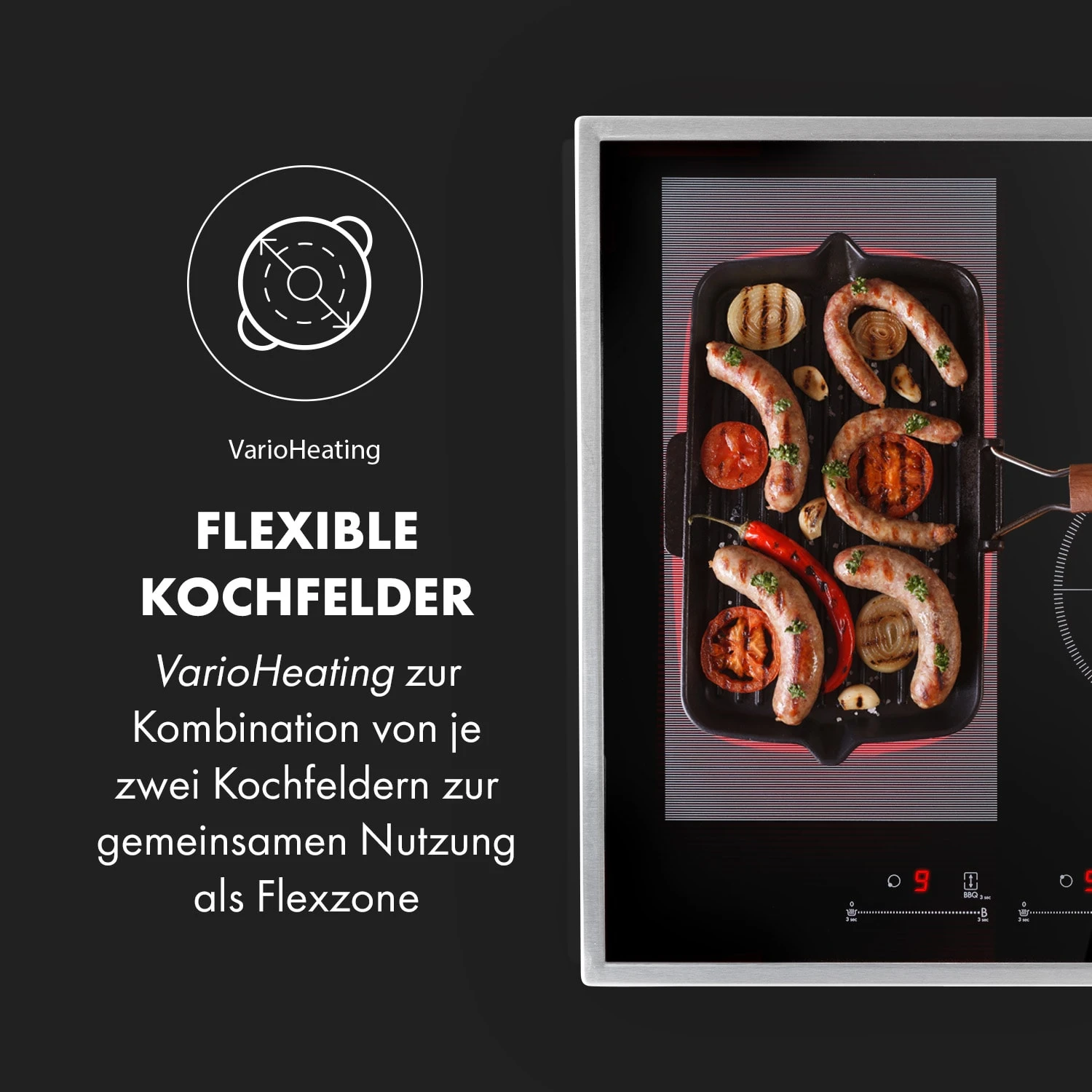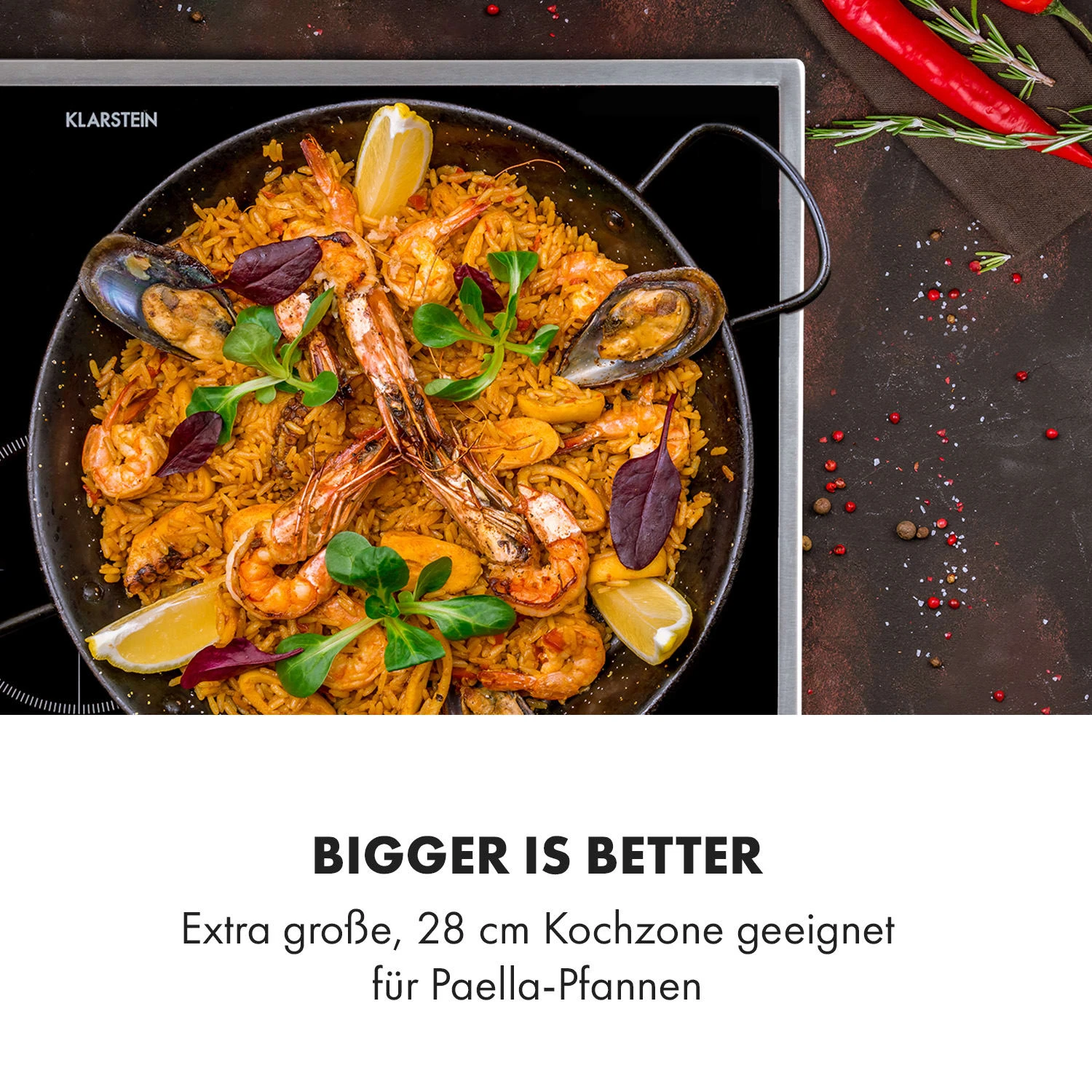 Vier Kochflächen für den Genuss bietet das Klarstein Delicatessa 77 Hybrid Prime Einbaukochfeld bei einer Gesamtleistung von max. 7000 Watt, die sich mit 1 x 2500, 1 x 2000 und 2 x 1500 Watt auf die einzelnen Kochflächen verteilen und die Inhalte von Töpfen und Pfannen in Spitzenzeiten zum Kochen bringen. Dabei vereinen sich per VarioHeating die beiden linken Kochzonen zu einer Flexzone: Mit maximaler Flexibilität passt sie sich dank Topferkennung an die Größe der darauf gesetzten Töpfe, Pfannen oder Kasserollen an und erhitzt so auch großes Kochgeschirr, das nicht auf ein einzelnes Kochfeld passt. Damit verbraucht die Delicatessa 77 Hybrid Prime zum einen wirklich nur die Energie, die für den Topf passend ist und ermöglicht zum anderen die Nutzung fast jeder Topf- oder Pfannengröße. Auch an Freunde großer Pfannengerichte, wie Paellas, wurde bei der Delicatessa 77 Hybrid Prime gedacht. Ihre rechte Kochzone durchmisst glatte 28 cm und bietet so spielend auch den ganz großen Pfannen den nötigen Platz. Alle Einzelfelder sowie das Flexfeld lassen sich separat in ihrer Leistung regeln und verfügen über eine ThermoBoost-Funktion, mit der die Leistung zum schnellen Erhitzen nochmals auf bis zu 3500 Watt gesteigert wird. Bedient wird das Klarstein Delicatessa 77 Hybrid Prime Glaskeramik-Kochfeld unkompliziert mit einem integrierten SenseControl Touch-Panel mit Touch-to-slide-Regler zur Leistungskontrolle und Digitaldisplay. So durchbrechen weder Knöpfe noch Regler die Oberfläche der Küchenzeile. Neben der Leistung kann für jedes Kochfeld ein bis zu 99-minütiger Timer programmiert werden, der entweder nach Ablauf der eingestellten Zeit die Kochplatte abschaltet oder ein akustisches Signal ertönen lässt.
