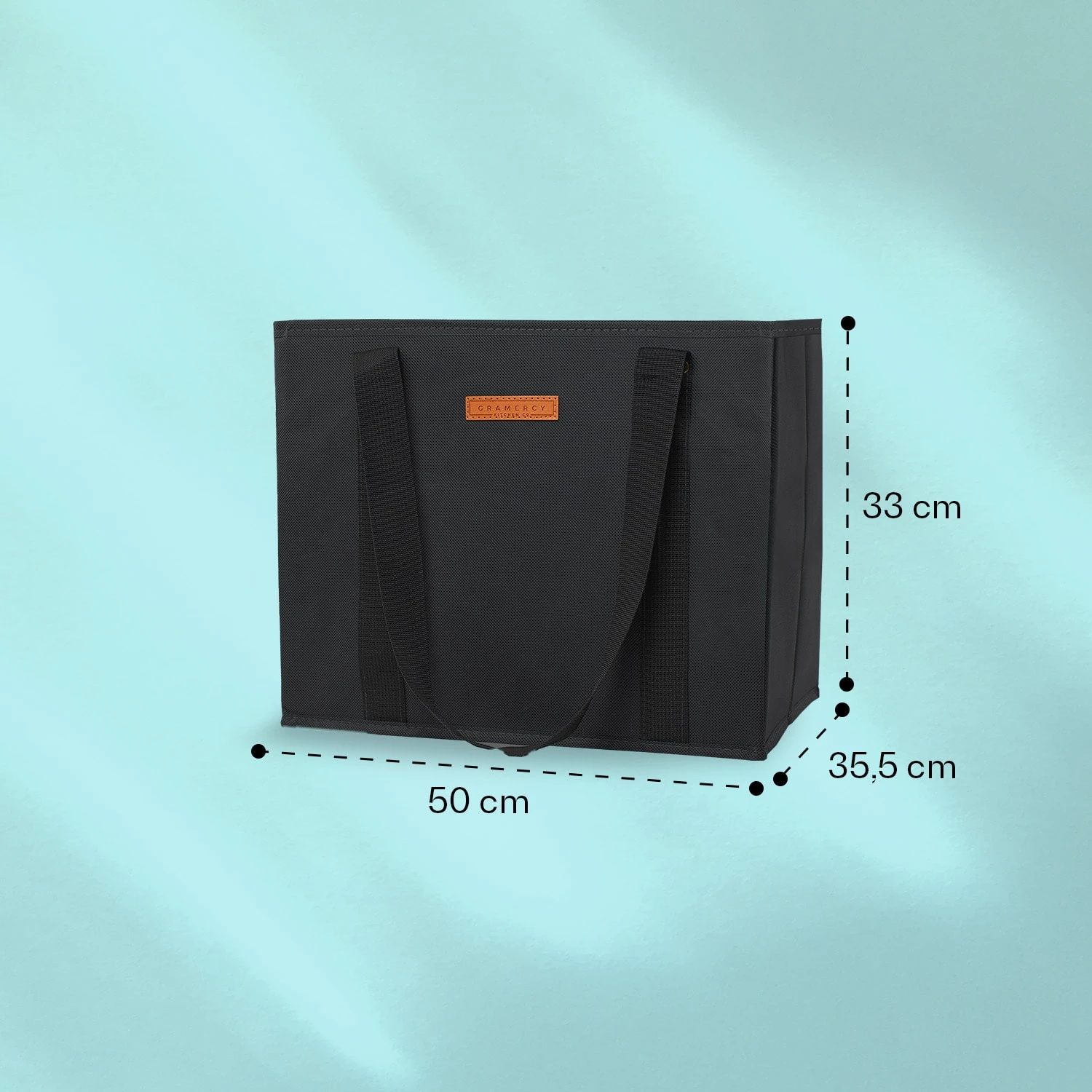 Unsere wiederverwendbaren, faltbaren Einkaufstaschen von Gramercy by Klarstein werden dich begeistern. Die Seiten und der Boden sind von innen mit recyceltem Kunststoff verstärkt, dadurch lassen sie sich leicht Befüllen und stehen kippsicher im Kofferraum oder Fahrradanhänger. Dank der wasserabweisenden Beschichtung kannst du die Shopping Bag einfach mit einem feuchten Tuch abwischen oder im Schonwaschgang in der Waschmaschine reinigen. Ausgestattet mit zwei breiten, robusten Nylongriffen bewältigen sie spielend ein Belastungsgewicht von 13 kg. Ihr zeitloses, schlichtes Design wird von einem veganen Kunstleder-Patch veredelt.