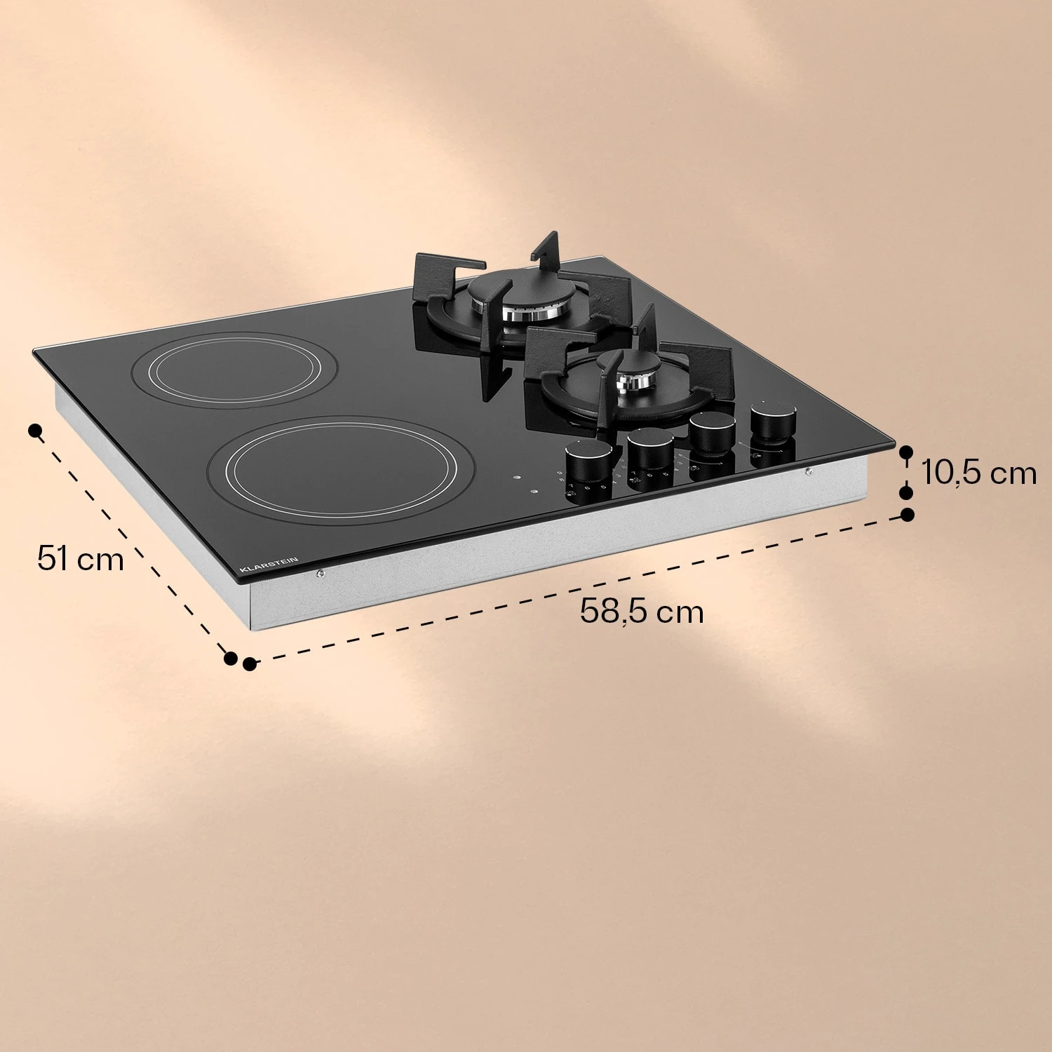 Das MultiChef 4 Kombi-Gaskochfeld von Klarstein ist die ideale Verschmelzung von 2 Gaskochstellen und 2 Glaskeramikkochfeld zu einem echten Multitalent. Mit insgesamt 6,4 kW Leistung, 2 unterschiedlichen Brennergrößen sowie 2 gusseisernen Topfträgern ist es für jede erdenkliche Mahlzeit bestens ausgerüstet. Über die leichtgängigen Drehregler kannst du die Flammengröße jederzeit bequem anpassen. Die Oberfläche aus gehärtetem Keramikglas sieht bei nicht nur edel aus, sie ist auch wunderbar pflegeleicht. Das elektrische Zündsystem mit Flammenausfallschutz sorgt für eine sichere Handhabung.