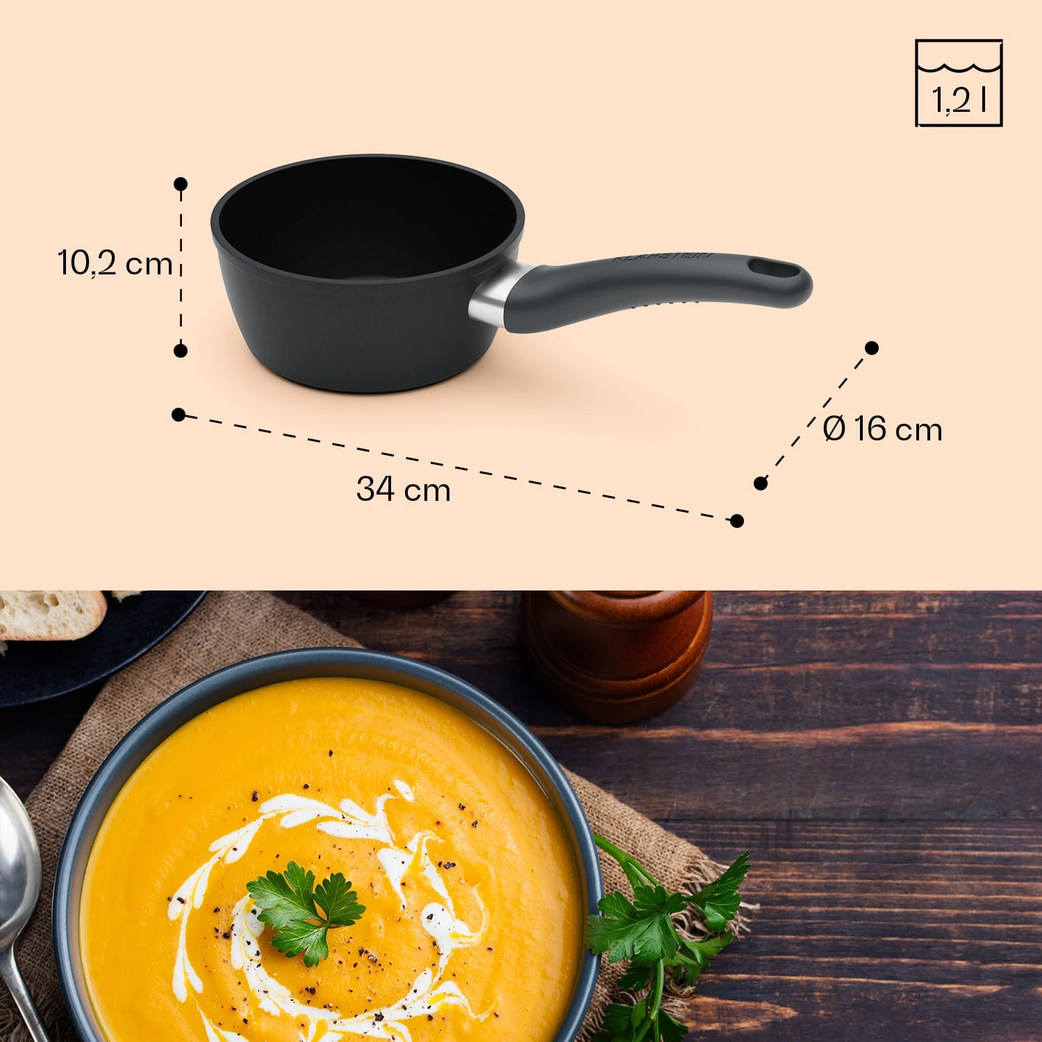 Für Abwechslung auf dem Herd – Design made in Berlin: Die Klarstein Noto Endurance Kasserolle ist dein neuer praktischer Helfer in der Küche, wenn es darum geht, Kaltes heiß zu machen. Der 16 cm durchmessende Stieltopf aus geschmiedetem Aluminium fasst bis zu 1,2 Liter und ist für alle Arten von Küchenherd von Gas bis Induktion geeignet. Bei dem ergonomischem Cool-Touch-Stielgriff haben unsere Berliner Designer besonders auf einfaches und unkompliziertes Handling geachtet. So hast du volle Kontrolle über den Topf, wenn du Soßen und Cremes zubereitest. Die PTFE-Anti-Haft-Beschichtung ist PFAS-frei und ausgesprochen langlebig. Und natürlich ist der Klarstein Noto Endurance Kochtopf komplett spülmaschinenfest. So macht Kochen Spaß!