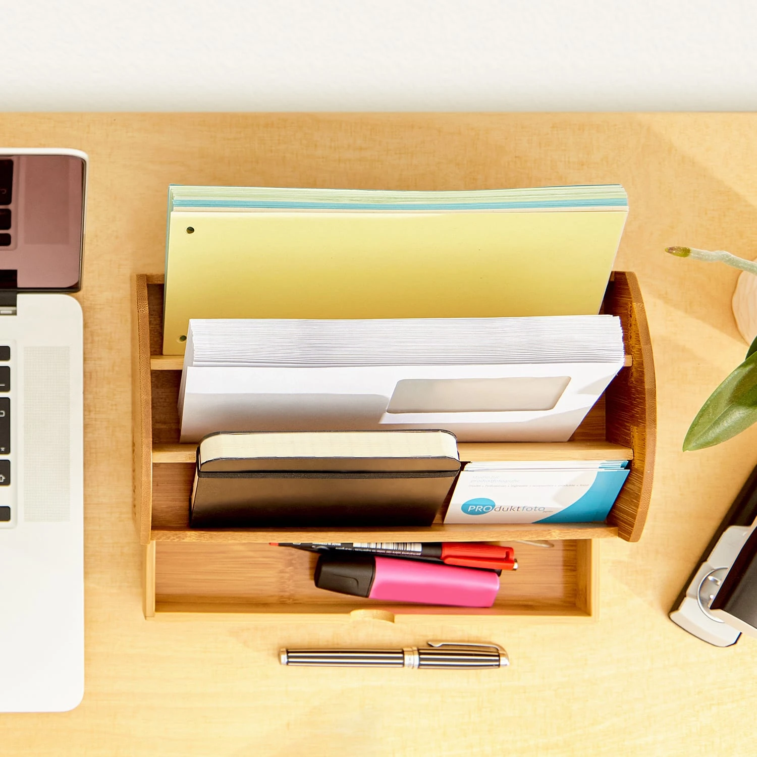 Ein ordentlicher Schreibtisch ist der erste Schritt zu einem entspannteren Leben. Denn – ob du arbeitest, zeichnest, schreibst, bastelst oder dich deiner täglichen Bürokratie widmest – mit dem Schreibtischorganizer mit Schublade von blumfeldt fällt dir alles leichter. Er schafft Ordnung und du kannst blind nach dem Stift greifen, wenn alles seinen alt bekannten Platz hat. Dank der 2 vorderen Fächer und dem tieferen Fach hinten gelingt es dir, ein gut sortiertes System in all deine Schreibutensilien zu bringen. Ob Briefe, Schreibgeräte, Notizbücher oder Trennblätter – alles findet hier seinen Platz. Und in der unteren Schublade kannst du geschickt Kleinkram aufbewahren oder sogar Dinge, die du vielleicht nicht auf den ersten Blick sehen möchtest.