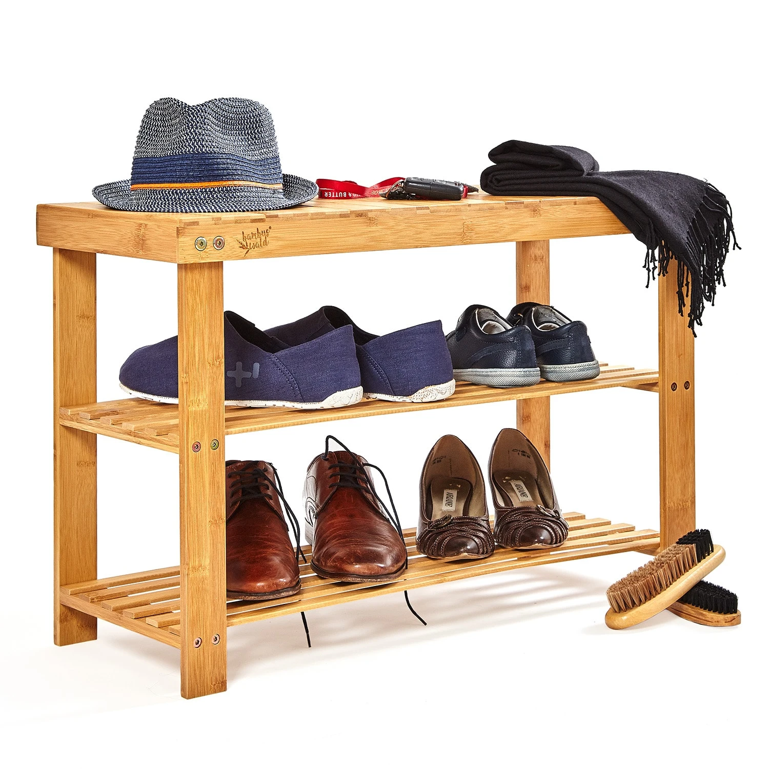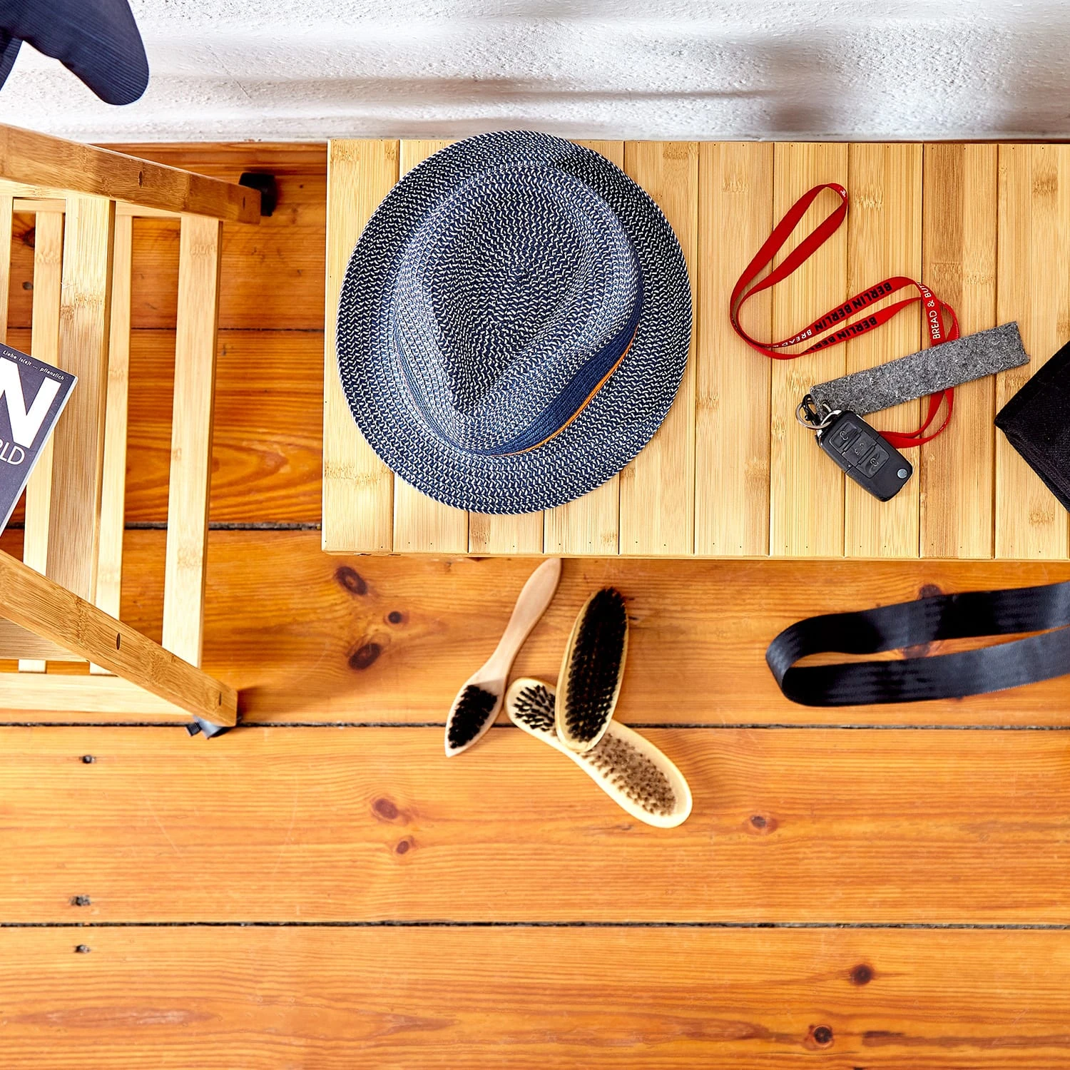 Verpasse deinem Eingangsbereich einen Hauch von Natur. Unsere blumfeldt Schuhbank aus Bambus ist ein natürlicher Blickfang in Flur, Diele, Treppenhaus oder Vorzimmer. Auf zwei Etagen bietet das Schuhregal Platz für deine liebsten Sneaker, Sandalen, Pumps und Slipper. Der Platz reicht locker für bis zu 8 Paar Schuhe. Der Zwischenraum zwischen den Etagen beträgt 17 cm.