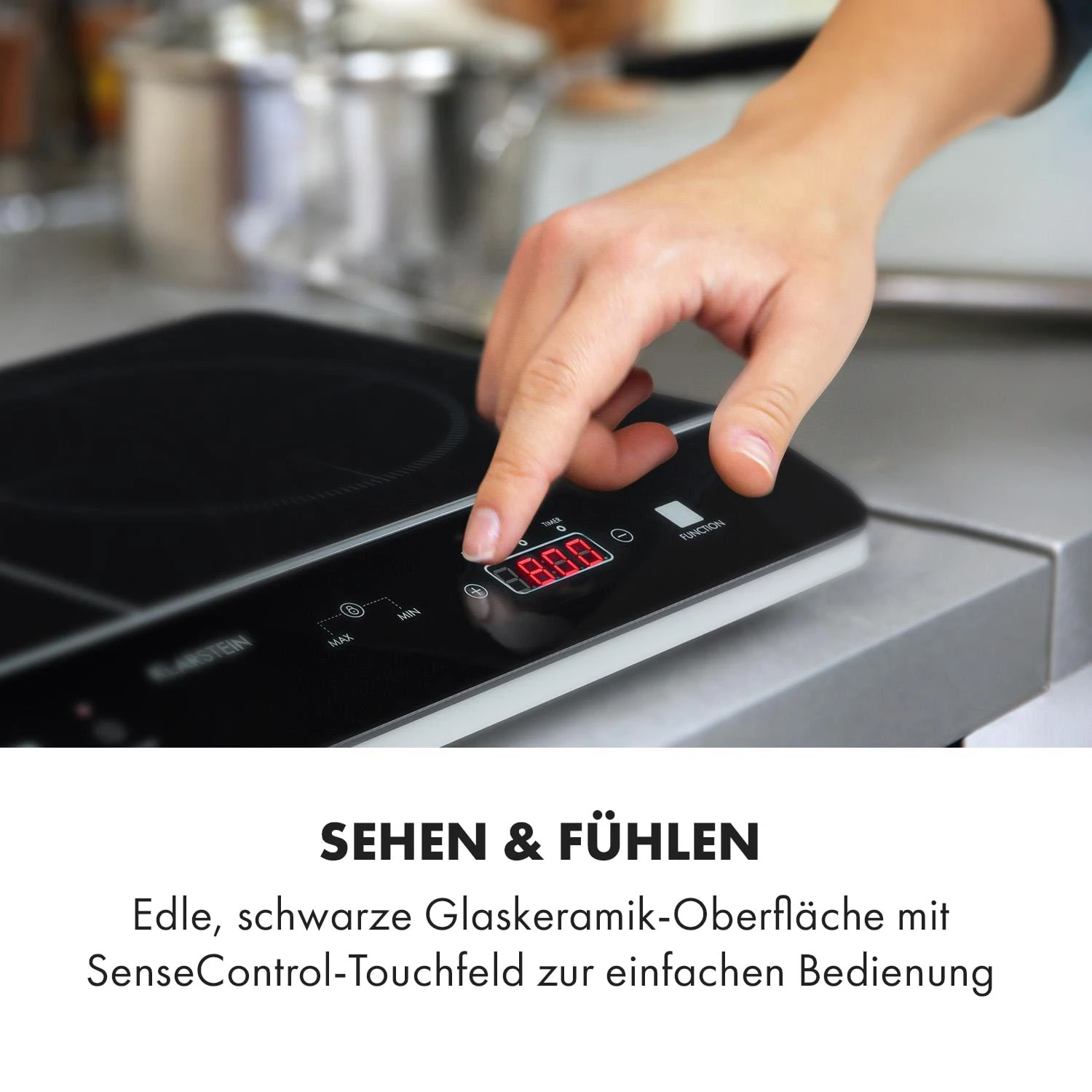 Zwei Induktions-Kochflächen für Töpfe und Pfannen mit Boden-Durchmessern von 12 bis 22 cm bietet das Klarstein VariCook Neo Induktionskochfeld, die mit insgesamt 3500 W Leistung den Topfinhalten einheizen. Dabei kann die linke Platte mit bis zu 2000 W und die rechte Kochplatte mit bis zu 2000 W Leistung betrieben werden, die in jeweils 6 Stufen separat regelbar sind. Bedient wird das Glaskeramik-Kochfeld über ein integriertes SenseControl-Touch-feld samt LED-Anzeige. Neben der Einstellung der Temperatur in 20-°C-Schritten von 60 bis 240 °C kann zusätzlich in 5-Minuten-Schritten ein Timer auf Kochzeiten von 5 bis 180 Minuten programmiert werden. Nach Ablauf der eingestellten Zeit schaltet er das Kochfeld automatisch ab. Weitere Automatik-Funktionen erleichtern die Bedienung und erhöhen die Sicherheit des Kochfelds: Die Kindersicherung aktiviert eine Tastensperre, die verhindert, dass Kinder das Gerät ungewollt bedienen oder nach der Programmierung Einstellungen versehentlich verändert werden. Die automatische Topferkennung sorgt dafür, dass nur benötigte Teile der Induktionsschleife aktiviert werden, was effektiv Energie beim Kochen spart. Zusätzlich wird ein Überhitzungsschutz aktiv, sollte ein Kochfeld zu heiß werden und die Automatikabschaltung schaltet das Gerät nach 2 Stunden Nichtnutzung selbstständig aus.
