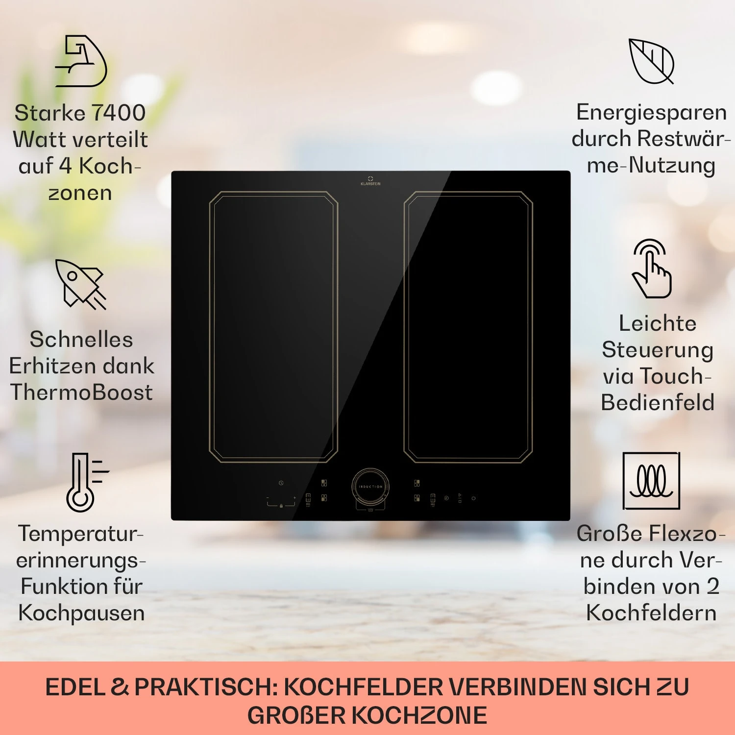 Einfach flexibler kochen: Das Klarstein Victoria 4 Flex Induktionskochfeld erlaubt die optimale Platznutzung mit minimalem Energieverbrauch beim Kochen. Vier Kochflächen bringen mit insgesamt 7400 Watt die Inhalte deiner Töpfe und Pfannen in Spitzenzeiten zum Kochen und können per VarioHeating zu zwei Flexzonen vereint werden. Alle Einzelfelder lassen sich separat in ihrer Leistung regeln und verfügen über eine ThermoBoost-Funktion, die mit erhöhter Leistung zum schnellen Erhitzen überzeugt. Bedient wird das Victoria 4 Flex Glaskeramik-Kochfeld unkompliziert mit einem integrierten Sensor-Touch-Bedienfeld und Digitaldisplay. So durchbrechen weder Knöpfe noch Regler die Oberfläche der Küchenzeile. Optisch überzeugt das Victoria 4 Flex Induktionskochfeld von Klarstein mit seiner pflegeleichten und edlen Oberfläche aus Glaskeramik: So fügt sich das Kochfeld spielend in jede Küchenzeile ein – egal ob klassisch oder modern.